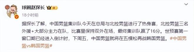 中国男篮已经集训了一周的时间,为了检验球员的状态,篮协安排中国男篮和北控男篮进行了一场热身赛。这场比赛保持了非常高的强度,北控男篮的三名外援里勒、西伯恩、佩里都打了很长时间,北控男篮一直保持着双外援阵容。中国男篮方面的表现也非常出色,一直掌控着比赛的主动,最终取得了16分的大胜。